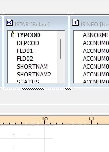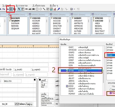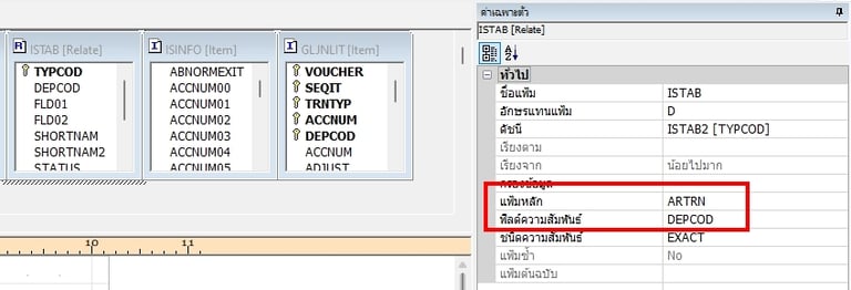 นำเคอร์เซอร์เม้าส์ไปชี้ที่ตาราง ISTAB และกดดับเบิ้ลคลิ๊กซ้าย จะปรากฎหน้าต่างค่าเฉพาะตัวแสดงขึ้นมา จากนั้นกำหนดแฟ้มหลัก "ARTRN" และฟิลด์ความสัมพันธ์ "DEPCOD"