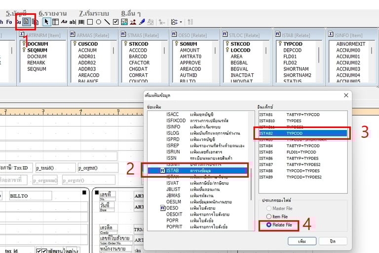 กดปุ่มเพิ่มข้อมูล (1) เลือกชุดข้อมูล ISTAB (2) เลือกอินเด็กซ์ TYPCOD (3) เลือกประเภทไฟล์ Relate File (4)