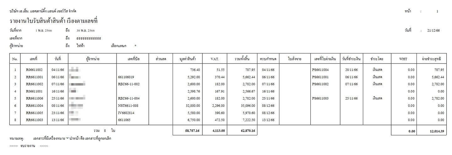รายงานใบรับสินค้า (ซื้อเงินเชื่อ) เรียงตามเลขที่
